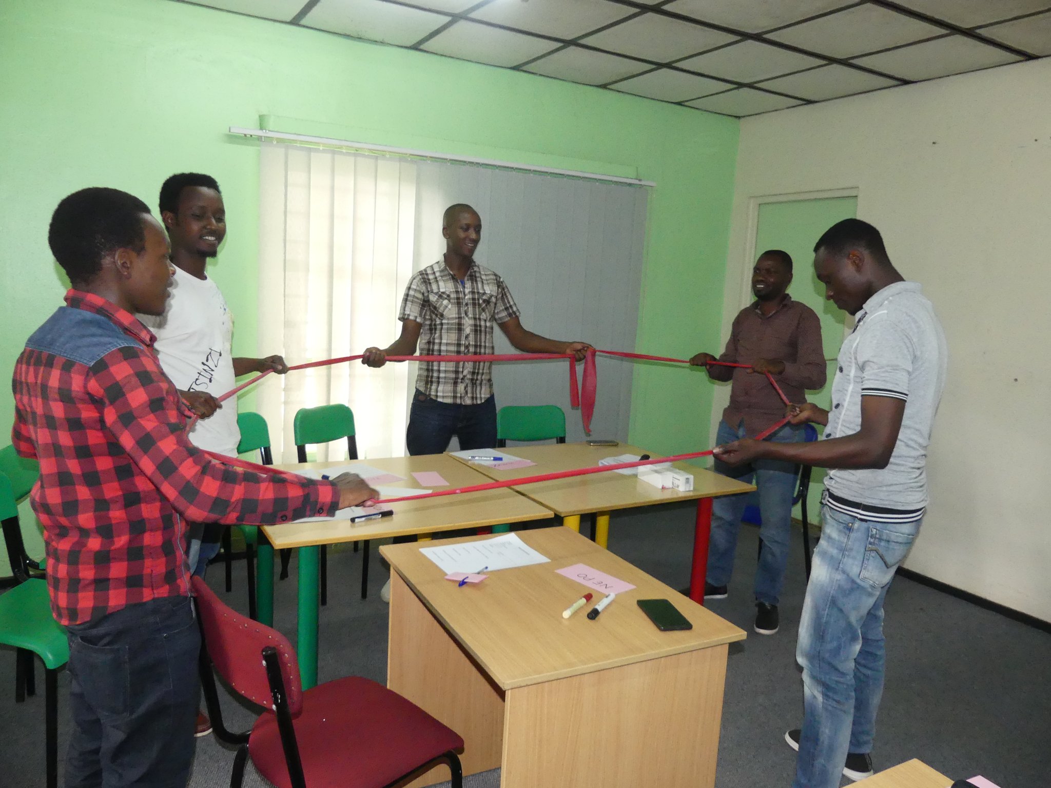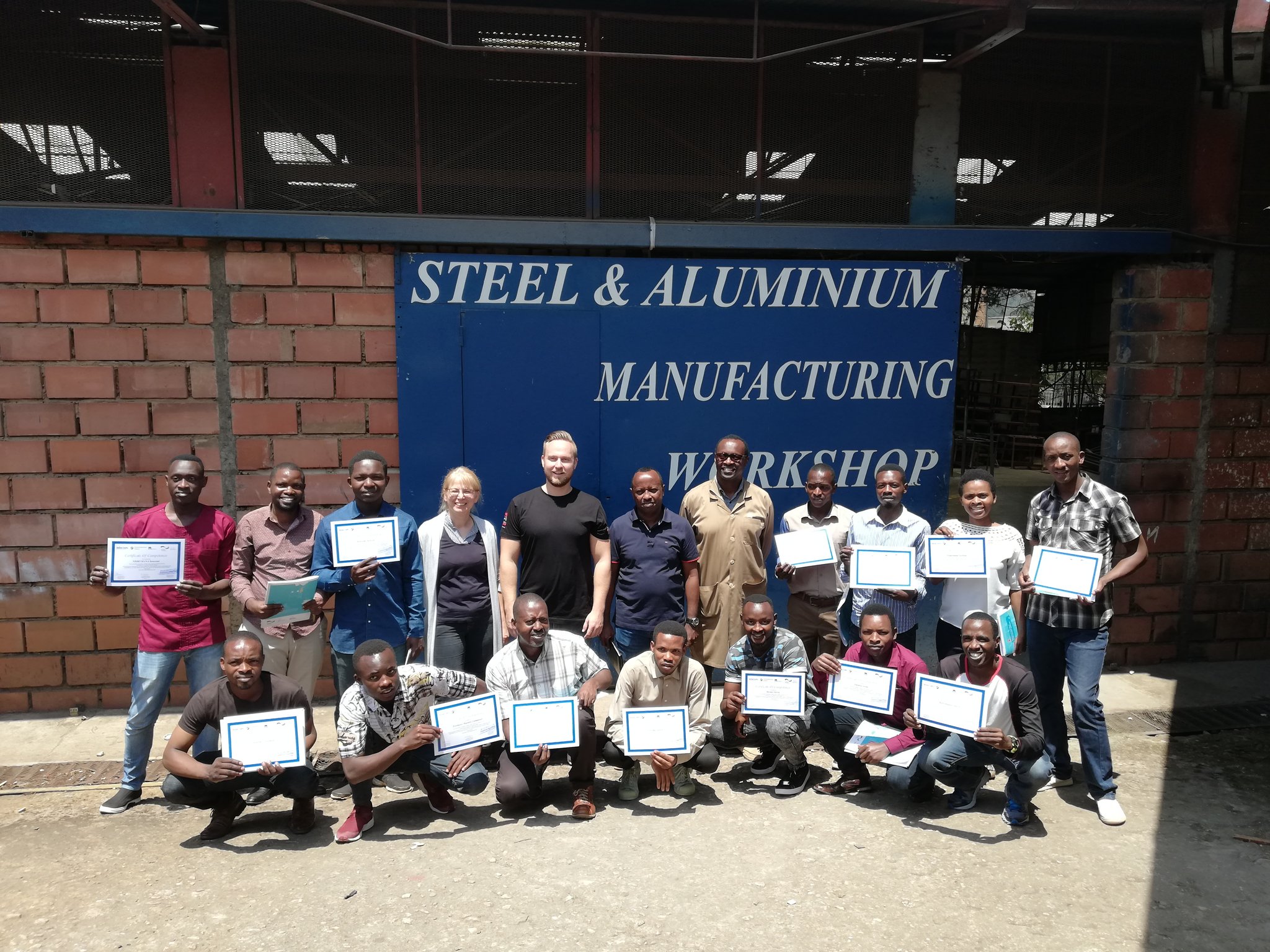 Manumetal ist ein ruandisches Unternehmen, das Möbel und Einrichtungsgegenstände aus Metall und Holz, Aluminiumrahmen für Fenstertüren, Büropaneele und andere Produkte herstellt und vertreibt. Trotz jahrelanger Erfahrung am Markt gibt es noch zahlreiche Herausforderungen in den Bereichen der grundlegenden Schweißtechniken und des Arbeitsschutzes zu meistern. Aus diesem Grund war die Sensibilisierung für Arbeitssicherheit und Gesundheitsschutz Ziel der zweiten Station des Einsatzes von Tanja Neumann, da diese Aspekte im Arbeitsalltag leider stark vernachlässigt werden. Dass die Hälfte der Teilnehmer kein Englisch und Tanja kein Französisch sprach, war zunächst ein unerwartetes Hindernis. Die Sprachprobleme konnten dann aber aktiv, durch abwechselnde Übersetzungen der Teilnehmer, in den Arbeitsschutzunterricht eingebaut werden, da auch im Alltag sichergestellt werden muss, dass die Anweisungen/Unterweisungen von allen Mitarbeitern verstanden werden.